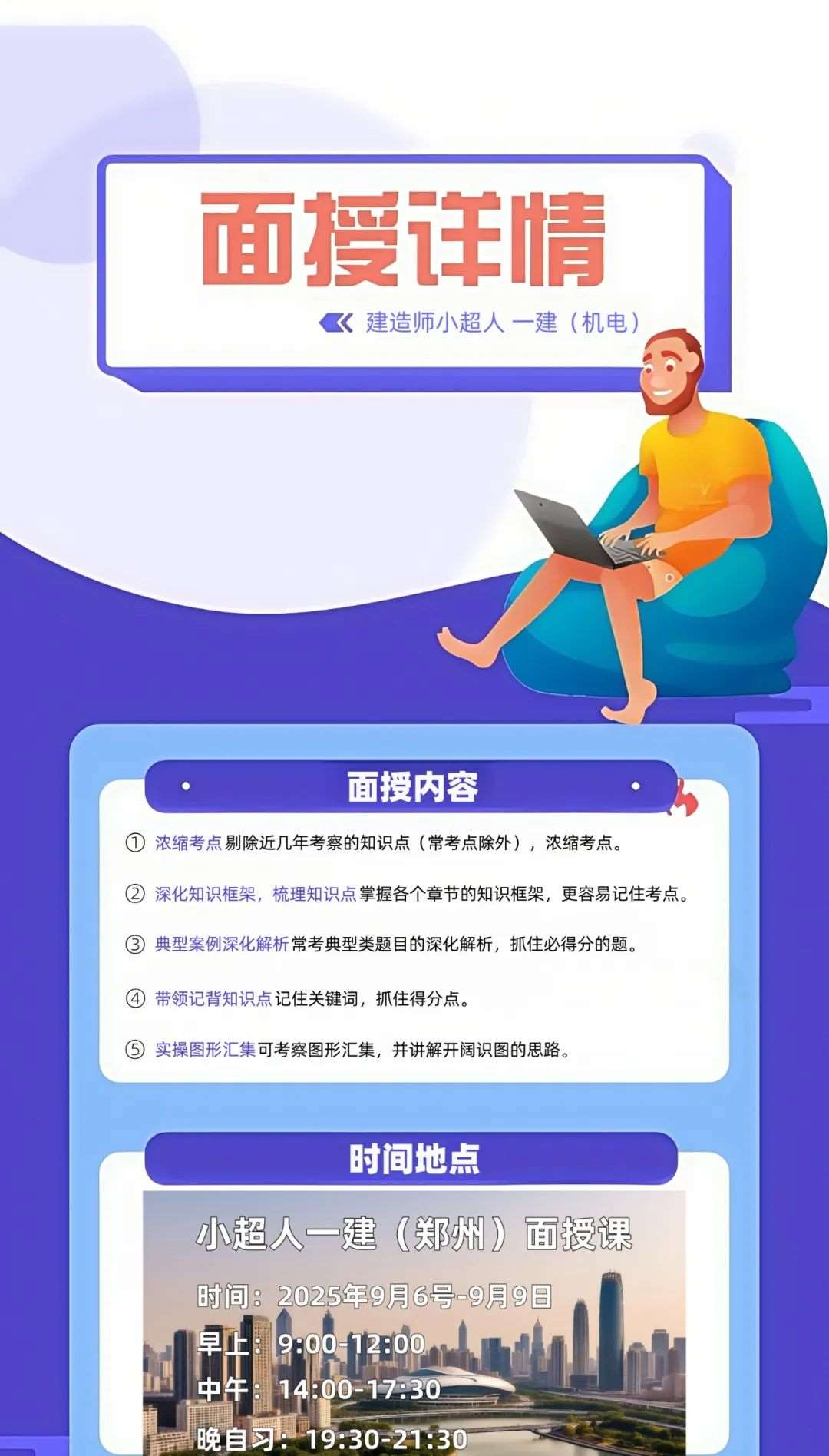 一建郑州面授9月举行,时间是6-9号,四天三晚,全程封闭;小超人一建(机电)面授已经全面开班招生啦!有很多考生比较关注面授现场老师会讲哪些内容?今天高sir给大家详细梳理一下咱们面授课的一个授课内容: