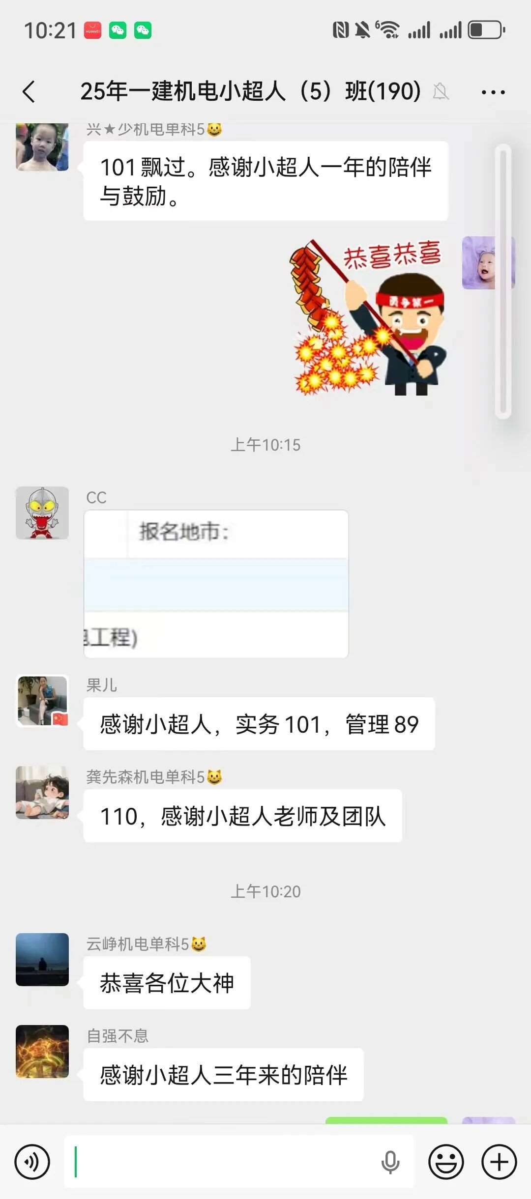 25年一建*一出,小编还来不及发布消息就看到群里的喜报太多啦,根本回复不过来,很多人一年考过的,也有2年三年一起努力过来的!小超人也是感谢大家的认可和支持,我们一起努力的结果肯定不会差!还有很多高分通过的学员,我就不在这里一一展示了;再次祝福通过的学员事业更上一层楼!没有考过的学员也不要气馁,尤其分数差的不多的,学习肯定也是下了很大功夫的,小超人老师也看到了大家的努力和付出,再此双十二来临之际,我们小超人给没有考过的考试也争取到100元的优惠卷!12月10日期至12月12日零点期间凭一建考试*截图,报名者一建可以优惠100元!